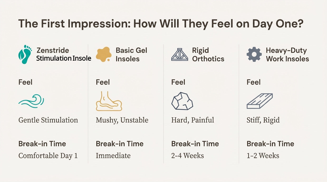 Smooth insoles absorb impact. ZenStride's texture does something different—it actively stimulates your feet. Think of it like the difference between a pillow (smooth) and a massage (textured).